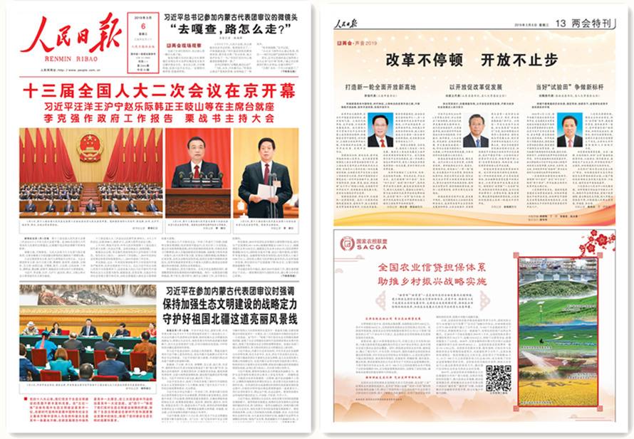 3月5日,十三届全国人大二次会议在北京召开。就在全国人大开幕第二天(3月6日),我国第一大报《人民日报》两会特刊以半个版的形式宣传了全国农担体系,向包括两会代表、委员在内的广大读者介绍了全国农担体系建设和作用发挥情况,展示了全国农担体系助力乡村振兴战略的信心和决心。