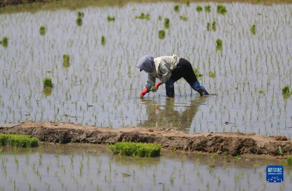 5月18日,在辽宁省沈阳市沈北新区兴隆台街道,农民在稻田里补种水稻秧苗。(图源:新华社)