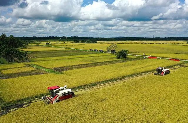 5月21日,收割机在海南省海口市红旗镇墨桥村的稻田作业。(图源:新华社)