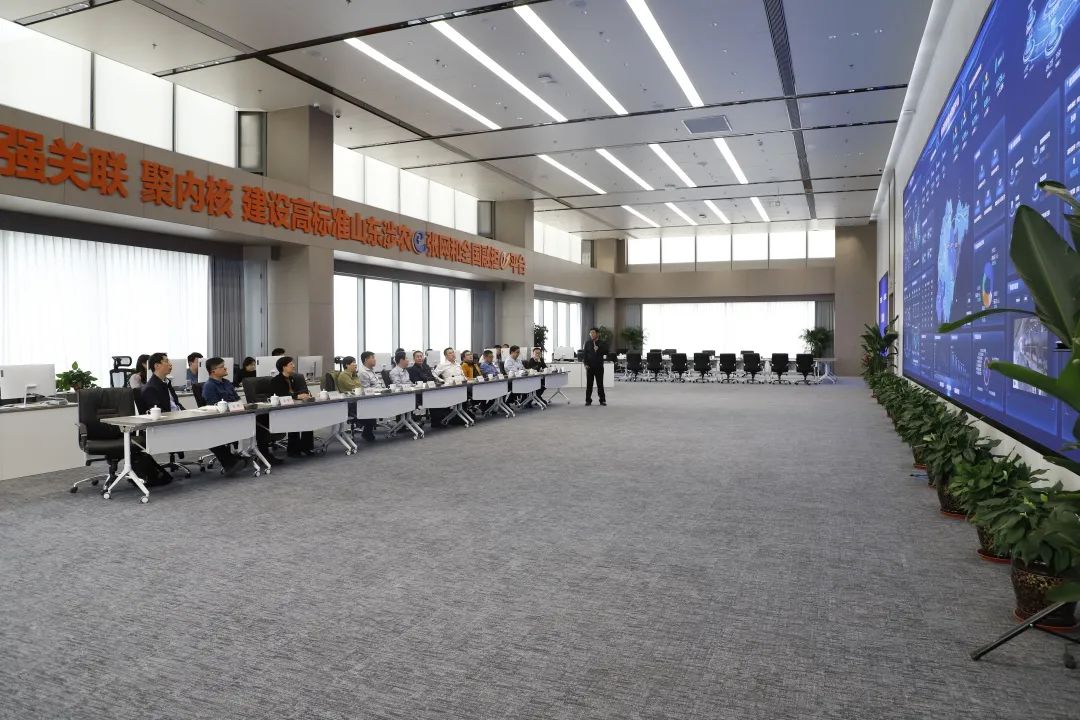 洪中强一行参观了担保大数据中心,了解了平台建设及应用情况,观看了公司宣传片,听取了山东农担业务开展情况及大数据转型赋能乡村振兴的成效和经验。随后,双方就农政银担合作、风险防控、数字化系统建设等方面进行了座谈交流。