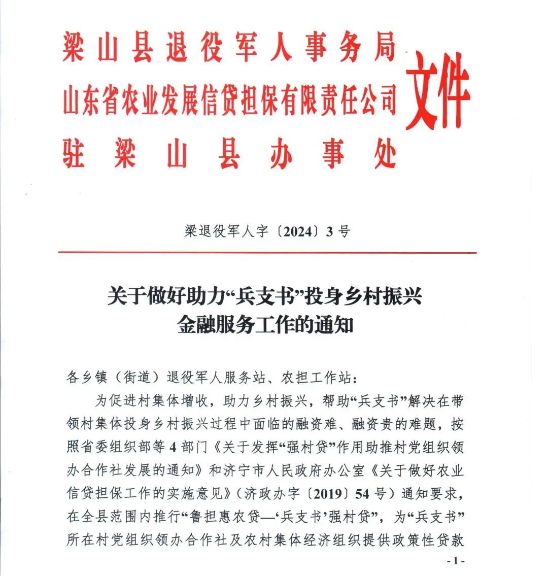 为促进村集体增收,助力乡村振兴,帮助“兵支书”解决在带领村集体投身乡村振兴过程中面临的融资难题,近日,山东农担济宁管理中心联合梁山县退役军人事务局共同出台了《关于做好助力“兵支书”投身乡村振兴金融服务工作的通知》,标志着农担公司在全省首个支持“兵支书”带动村集体创业的文件正式落地。