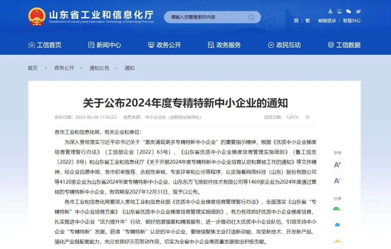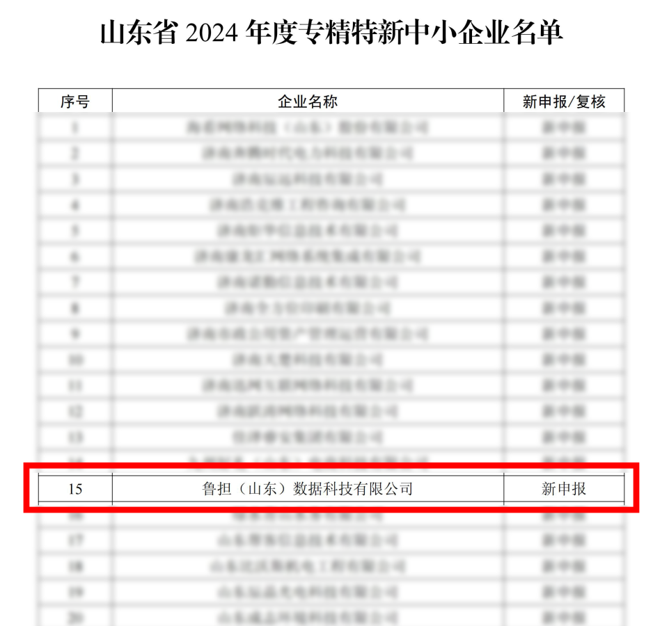 近日,山东省工业和信息化厅公布了2024年度山东省专精特新中小企业名单,经过初审推荐、合规性审核、专家评审和公示等程序,山东农担鲁担数据科技有限公司成功获得省级“专精特新中小企业”认定。
