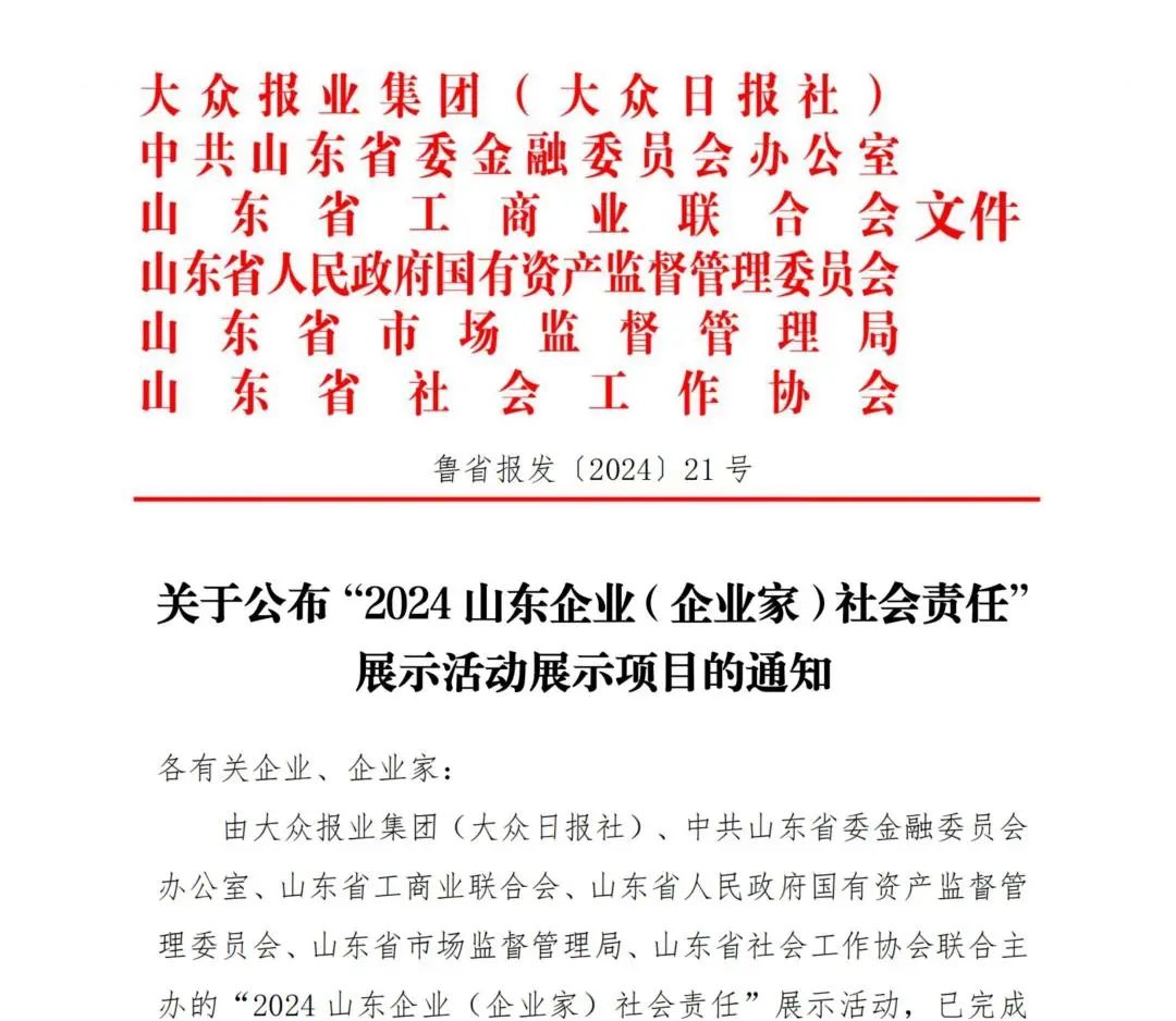 近日,由大众报业集团(大众日报社)、中共山东省委金融委员会办公室、山东省工商业联合会、山东省人民政府国有资产监督管理委员会、山东省市场监督管理局、山东省社会工作协会联合主办的“2024山东企业(企业家)社会责任”展示活动各项目揭晓。经征集、审查等程序,山东农担公司等80家企业入围“2024山东企业社会责任卓越实践”。