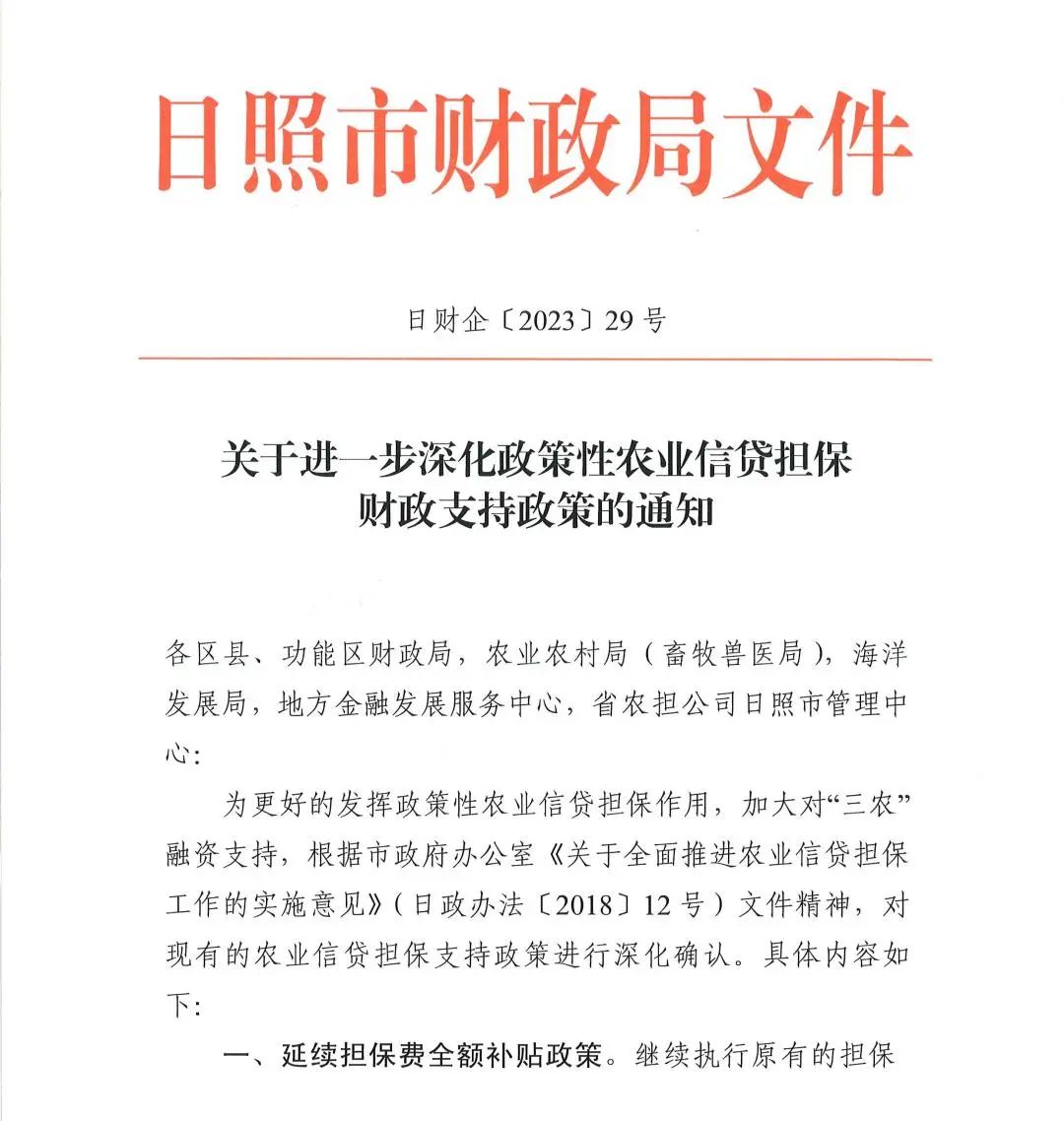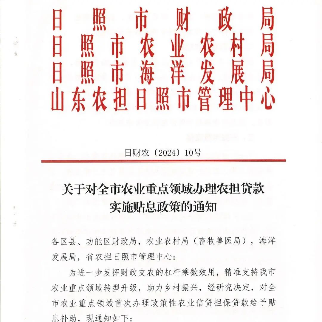 2024年11月日照市出台《关于对全市农业重点领域办理农担贷款实施贴息政策的通知》