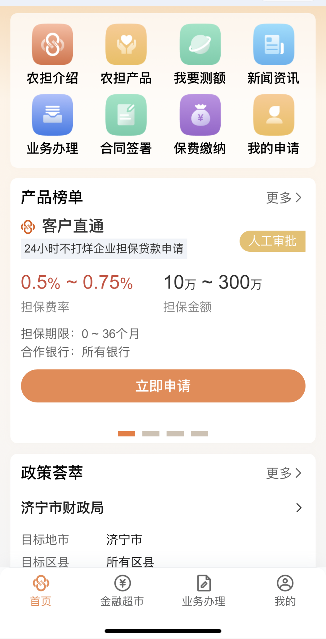 全新设计的小程序门户采用“4+N”功能矩阵布局,设置首页、金融超市、业务办理、客户中心四大模块,聚合农担介绍、政策荟萃、新闻资讯、业务办理、保费缴纳等服务内容,实现政策匹配精准触达、产品信息智能推送、服务流程透明可视,让农业经营主体“一屏尽览”农担服务全要素。