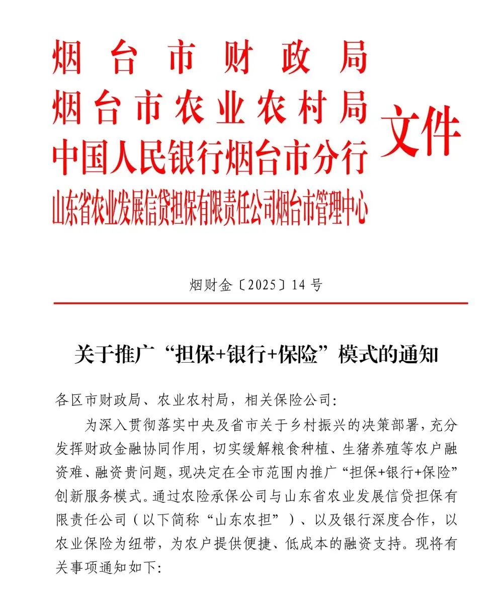 近日,烟台市财政局、市农业农村局、中国人民银行烟台市分行与山东农担烟台市管理中心联合印发《关于推广“担保+银行+保险”模式的通知》(烟财金〔2025〕14号,简称《通知》),为在全市范围内推广“担保+银行+保险”这一创新服务模式,切实缓解粮食种植、生猪养殖等农业经营主体融资难题提供了政策支持。
